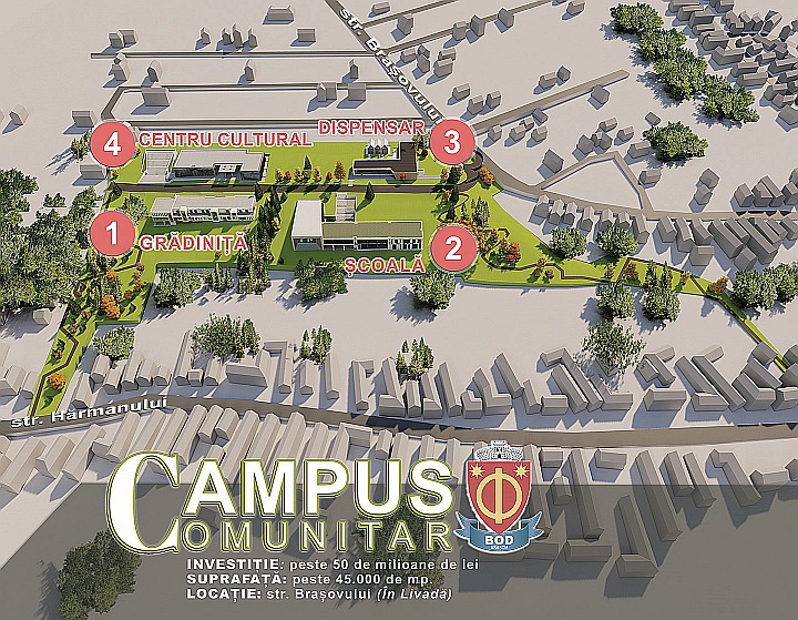 Der Gebäudekomplex „Campus Comunitar“ wird vier Gebäude umfassen: Kindergarten, Schule, Kulturzentrum und Ambulanz (Dispensar), die „auf der Hill“ (în Livadă) auf einer Gesamtfläche von 450.000 Quadratmetern errichtet werden. Die Kosten werden auf 50 Millionen Lei geschätzt.